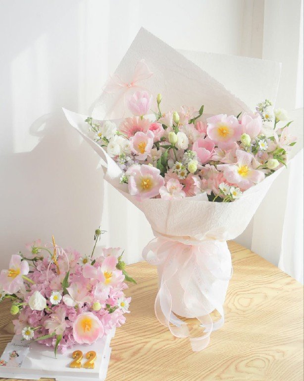 Hydrangea Cake of tulip Bouquet & Pretty in Tulip Pink (Combo Set ) — New Arrival (Bouquet L /Cake Bouquet – S)