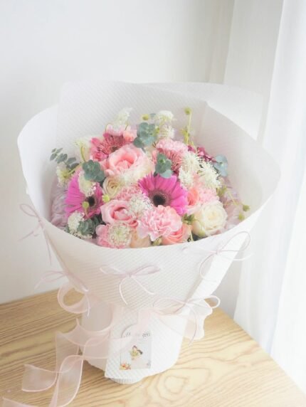 A cheerful garden-style bouquet featuring soft pink Gerbera daisies, lush roses, charming stock flowers, carnations, and delicate filler blooms.