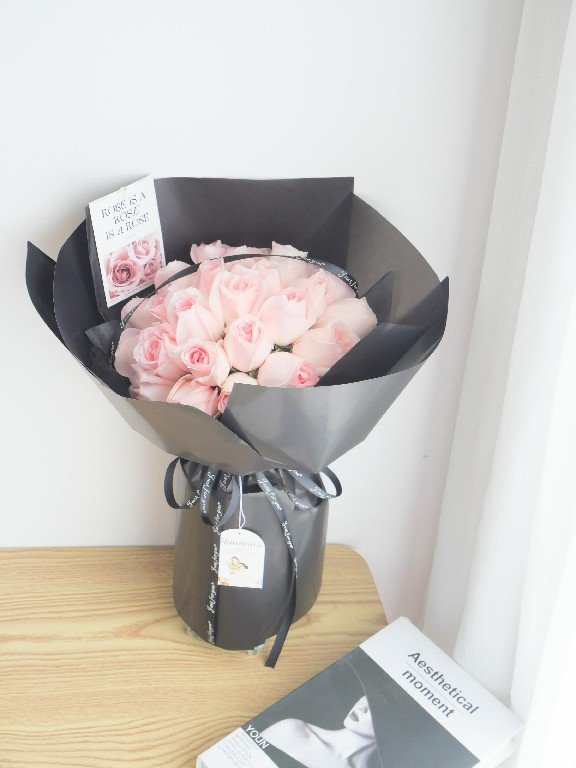 The roses are beautifully wrapped in sophisticated black paper, creating a striking contrast that makes the soft pink color stand out.